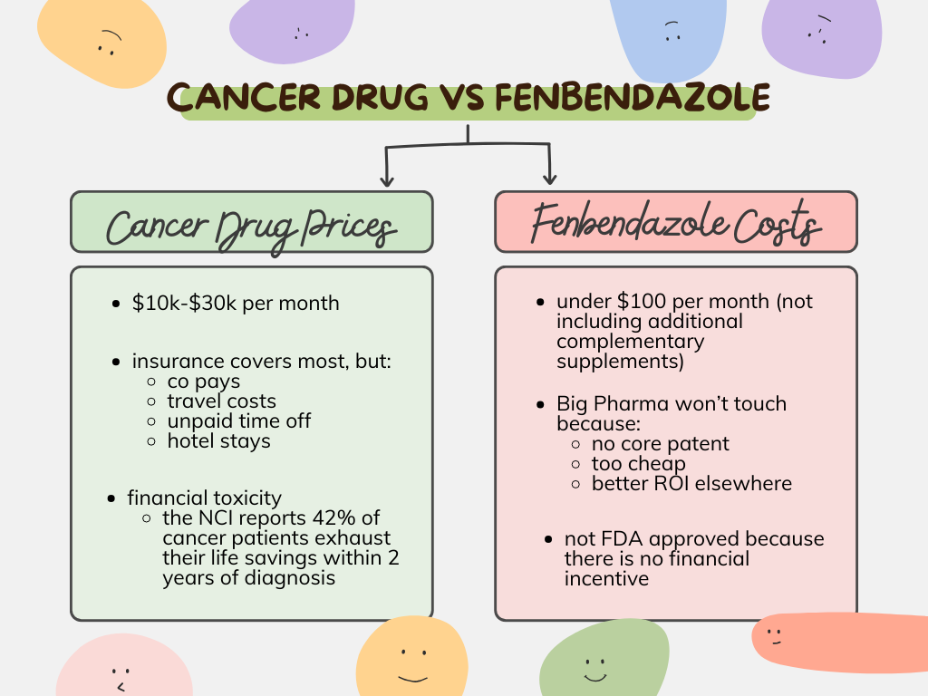 I decided to start with the medium dose of Fenbendozole, 222 mg (6 days a week), via the Joe Tippens Protocol. A 30 day supply was $41. (Source: fenbenlab.com)